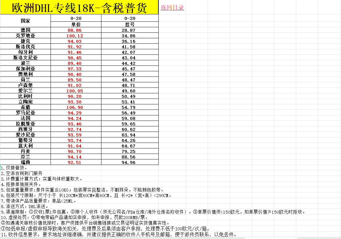 欧洲 DHL 专线・意大利空派含税到门